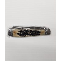 This folding pocket knife is 4.25" (10.8cm) closed. Satin finish 1065 carbon steel clip and spey blades. White smooth bone handle. Nickel silver bolster(s).