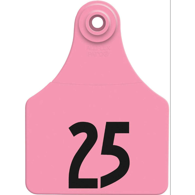 • Allflex Global ear tags provide the latest innovations in livestock visual identification. Numbered ear tags are printed in high contrast Allflex Laser-Ink Marking. Underneath a dark ink overlay is the matching laser number etched permanently into the surface of the tag. The laser markings are guaranteed not to fade for the lifetime of the animal. Allflex ear tags are made from polyurethane, making them completely waterproof, durable and snag proof. Improved retention collar design and self-piercing male buttons for easy application and reduced risk of infection. Large Allflex Global ear tags are for beef and dairy calf use. 3" high x 2-1/4" wide, 7/8" shaft, closed tip.
