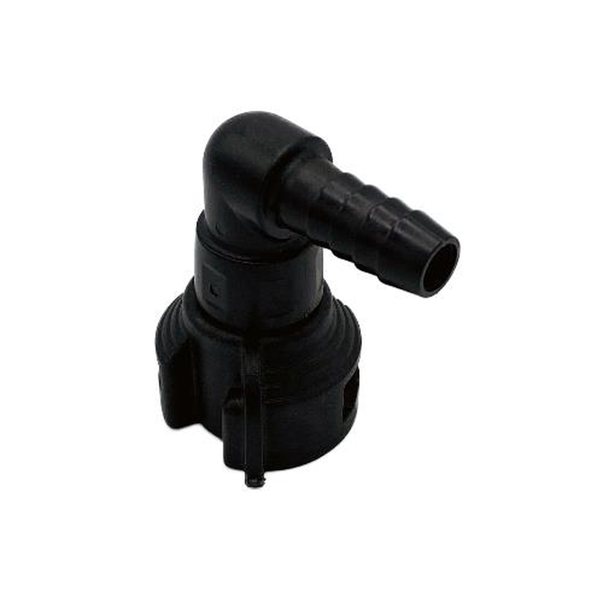 The polypropylene corrosion resistant connector is built to replace an elbow hose barb connector.