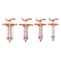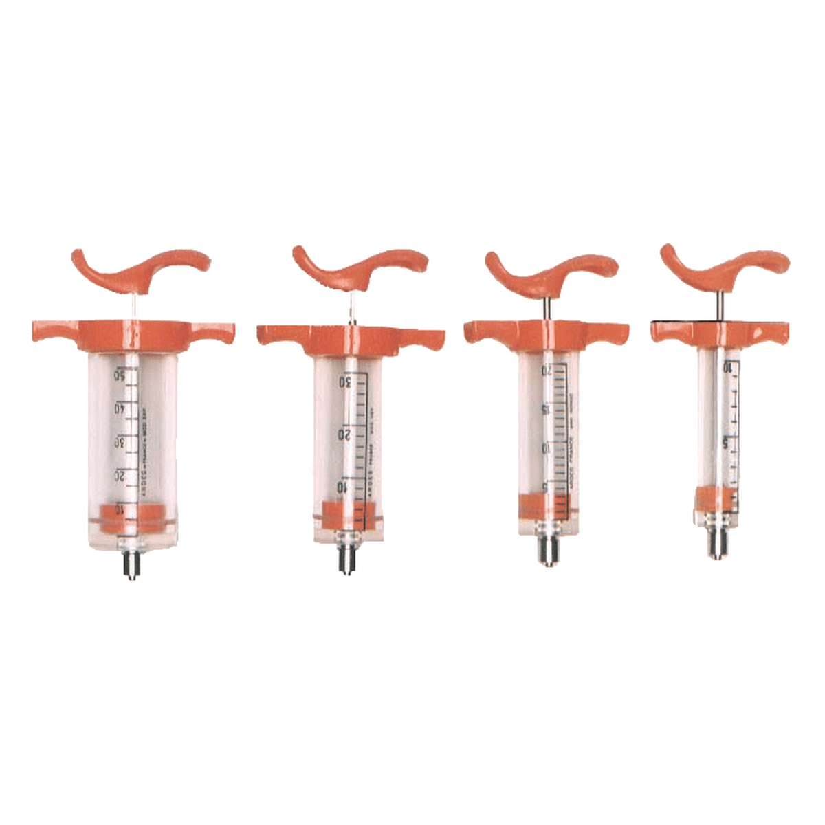 Durable long-lasting nylon syringes at economical prices. Clear plastic barrel has bold, black-inscribed numerals and orange handles. These eccentric-tipped syringes have luerlock/luerslip needle holder. Autoclavable up to 160 C, or 320 F; or sterilize in water up to 130 C or 260 F.