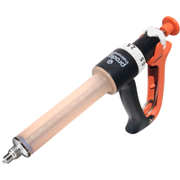 This Metal Adjustable Dose Repeater from Prodigy Instruments features an easy CDS System. Just Click (Click the button), Draw (Draw in fluid) and Squeeze (Squeeze to deliver). Comes with UV resistant poly barrel and versatile blue o-ring that is compatible with oil based vaccines. Ergonomic comfort grip metal handle and lever. Includes 3 colored knobs