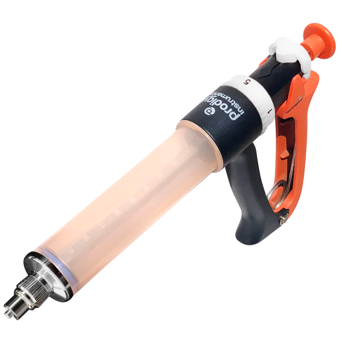 This Metal Adjustable Dose Repeater from Prodigy Instruments features an easy CDS System. Just Click (Click the button), Draw (Draw in fluid) and Squeeze (Squeeze to deliver). Comes with UV resistant poly barrel and versatile blue o-ring that is compatible with oil based vaccines. Ergonomic comfort grip metal handle and lever. Includes 3 colored knobs