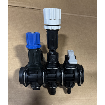 Includes Regulator With 3/4" Bottom Inlet, Blue Knob Agitator, Single Valve with 1/2" Hose Barb, Male End Plug, and Female End Cap.