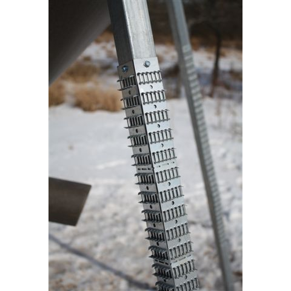 Shark Teeth work on the principle of abstinence. If they can't touch it, climb it, bump it or lick it; they can't tear it up, knock it over, eat up your feed or waste it. Apply steel Shark Teeth to the feeder legs to create a barrier that deters critters. Line the inside of the feeder legs to keep Hogs from rubbing or bumping them. Line the outside of the legs to prevent Raccoons from climbing, and pigs and livestock from pushing and bumping your feeder.