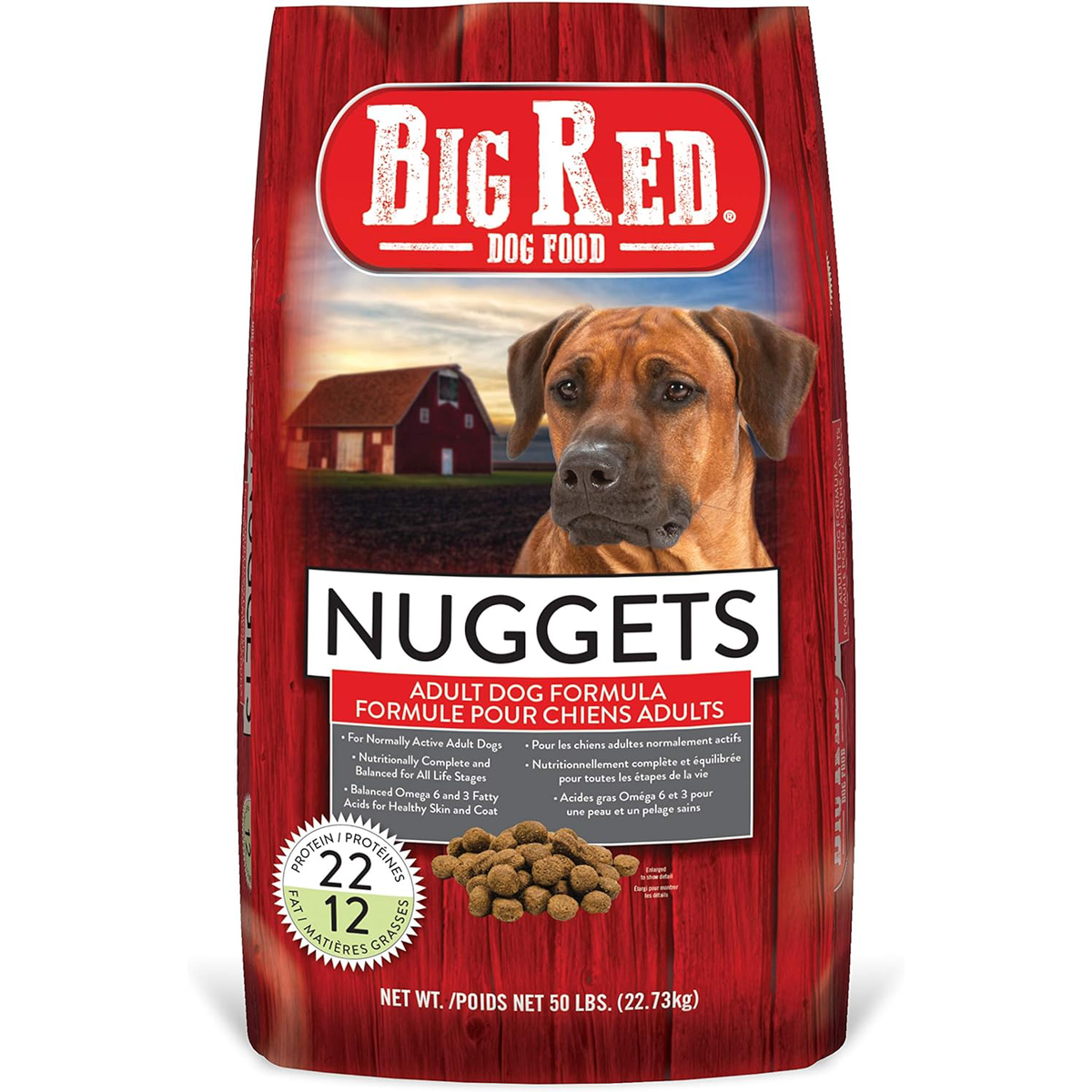 Big Red Nuggets Adult Dog Food. 50lb Dog Food. 22% Protein/12% Fat. For Normally Active Adult Dogs. Nutritionally Complete and Balanced for All Life Stages. Balanced Omega 6 and 3 Fatty Acids for Healthy Skin and Coat.