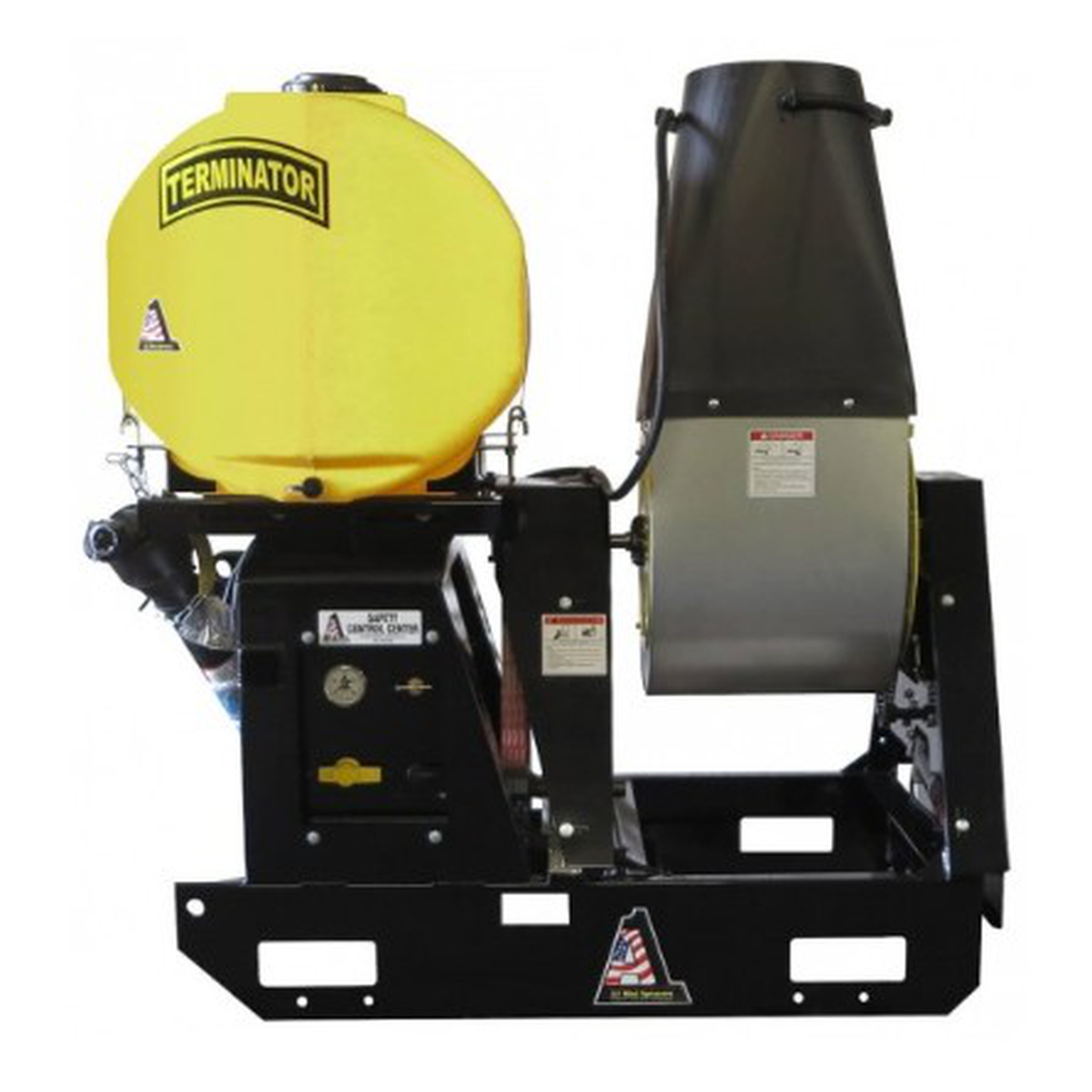 Make pests and weeds say, "I'll Not Be Back" with the Terminator Mist Sprayer. Be relentless with the chain and sprocket, 210 degree electric rotating fan that mists up to 80 feet vertically and 140 feet horizontally from the A1 exclusive four nozzle cannon volute. This mist sprayer features a belt-driven, cast iron Hypro 6-roller pumping system that is excellent for applying soluble powders, emulsions, herbicides, pesticides, and fertilizers. Comes complete with a wiring harness that can adjust throttle speed, fan rotation, and liquid on/off controls. Features a side mounted safety control center that includes a line strainer, pressure gauge, pressure regulator, tank drain valve and back flush system. Frame made of heavy duty steel that has a stump jumper design. Lift on/off vehicles with the easy to use forklift holes. Standard with a PTO shaft that connects with category I,II and III tractors.