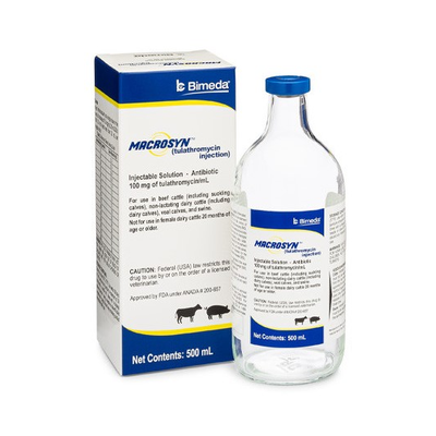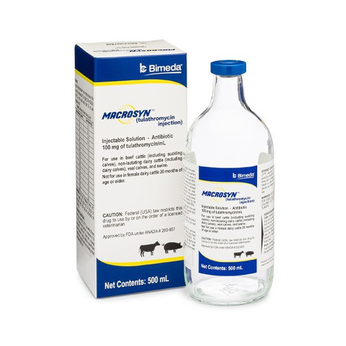 In beef and non-lactating dairy cattle, Macrosyn is approved for the control & treatment of bovine respiratory disease (BRD) (Mannheimia haemolytica, Pasteurella multocida, Histophilus somni, Mycoplasma bovis), treatment of bovine foot rot (Fusobacterium necrophorum, Porphyromonas levii), and treatment of pink eye (Moraxella bovis)