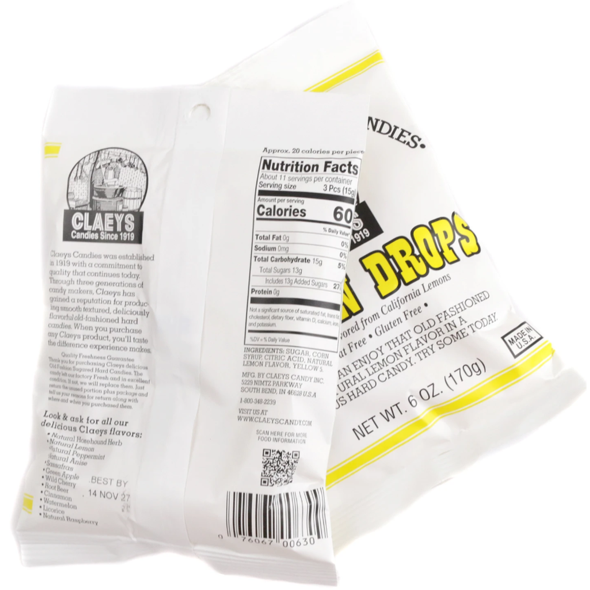 Claey's Hard Candy Drops Lemon 6oz Bag. Like the old fashioned hard candies? Why not enjoy Claeys Old Fashioned Hard Candies, full of Lemon flavor, in an old-fashioned bag?