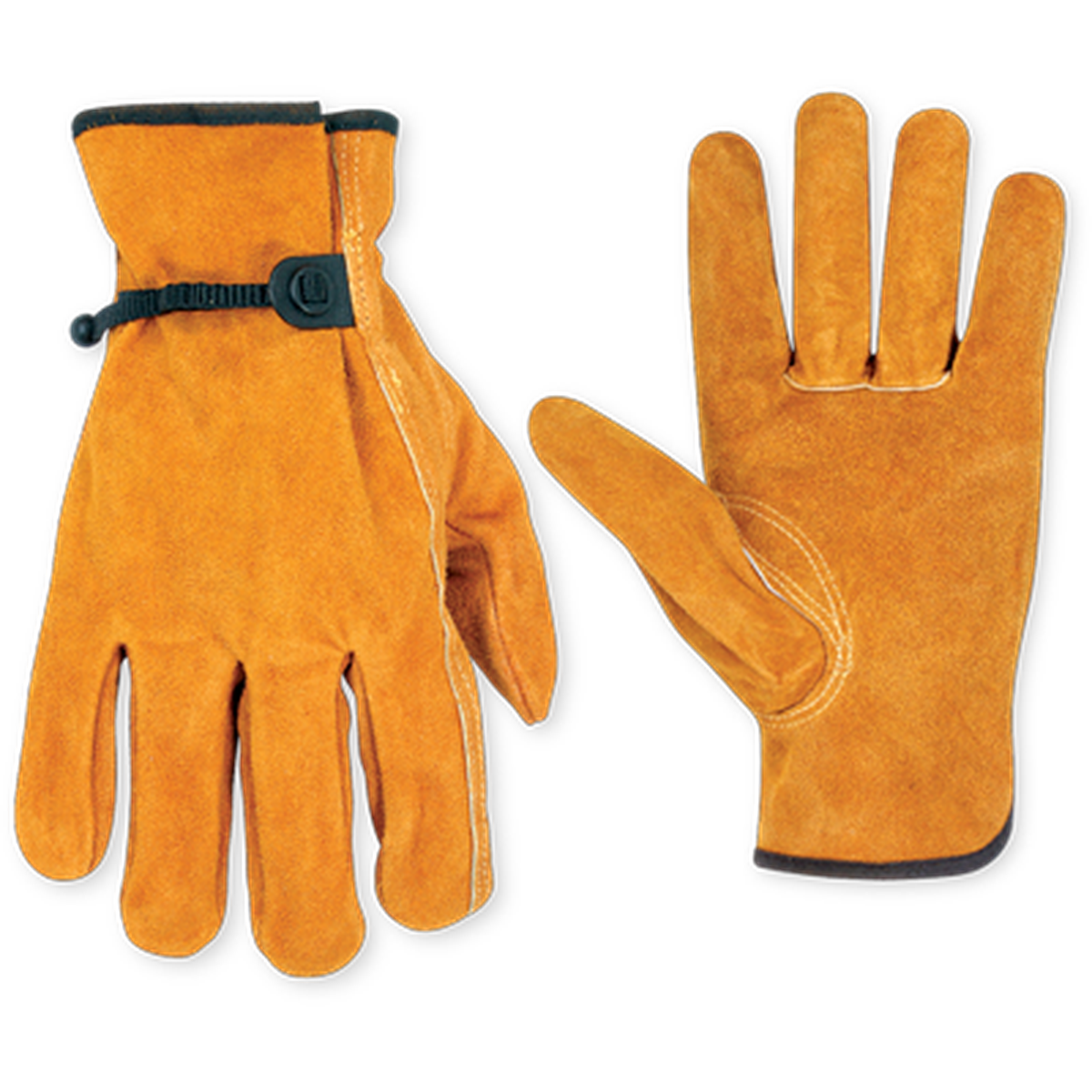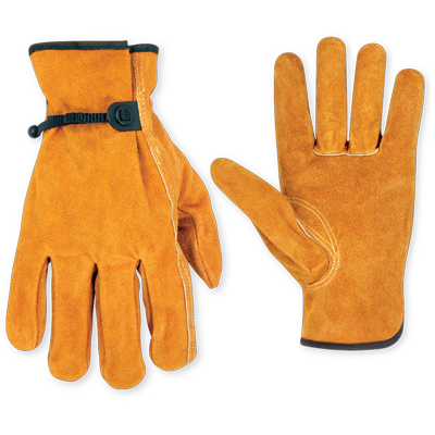 Deluxe quality, split cowhide driver work gloves have a Gunn-cut style palm and a cinchable tape and ball wrist closure.