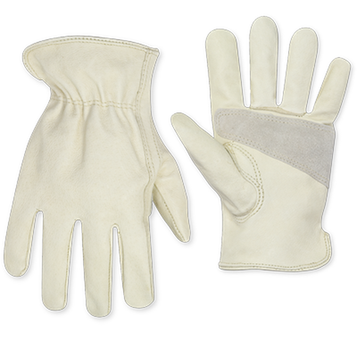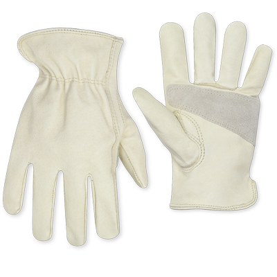 Deluxe quality, top grain pigskin driver work gloves have a leather palm patch and an open cuff with a shirred wrist.