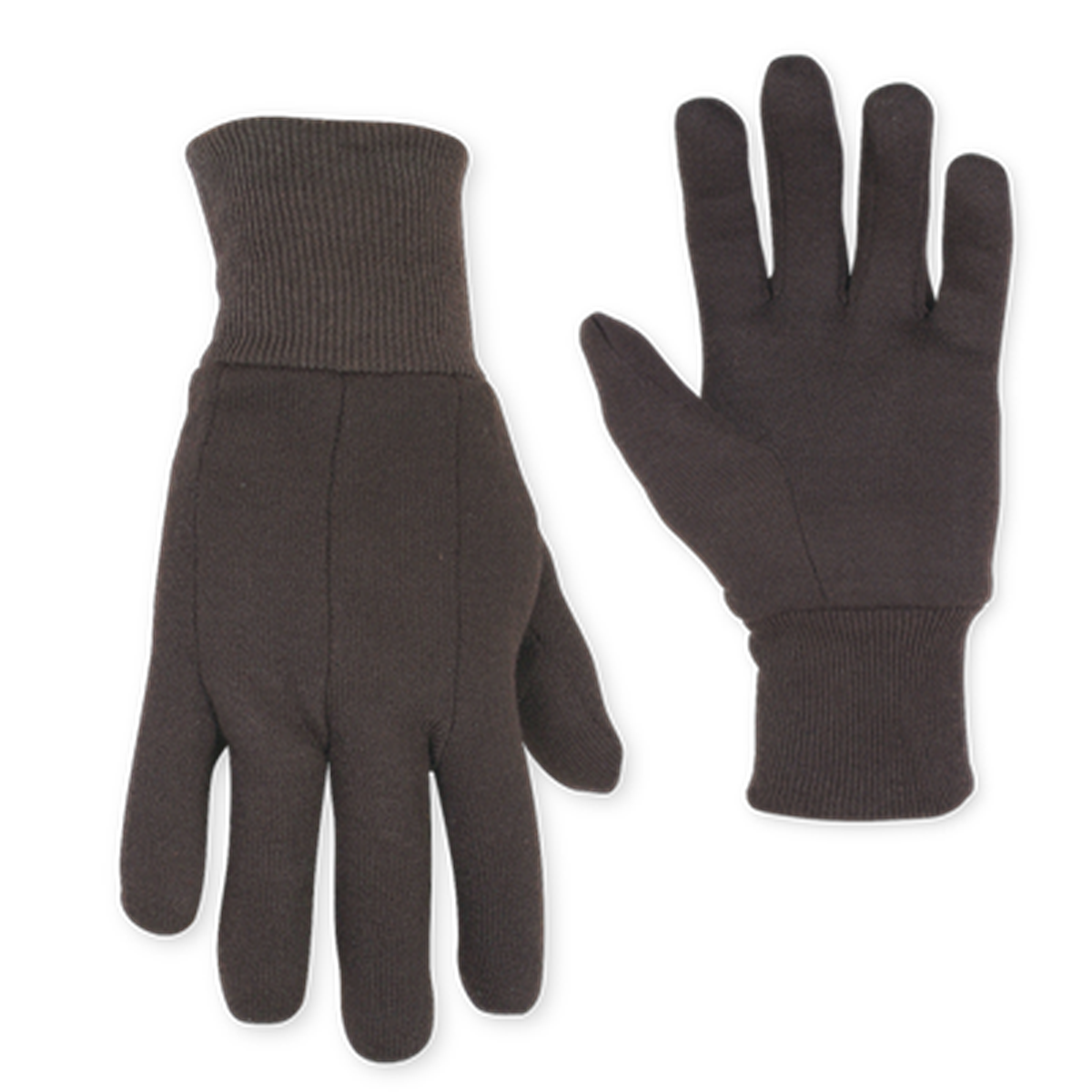 Standard weight cotton/polyester brown jersey work gloves with a knit wrist cuff.