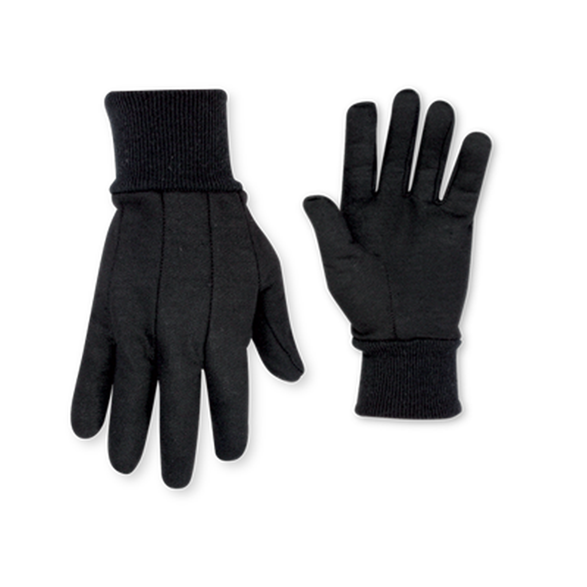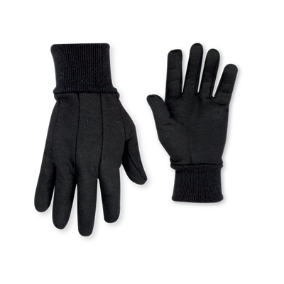 Heavyweight cotton/polyester black jersey work gloves with a knit wrist cuff.