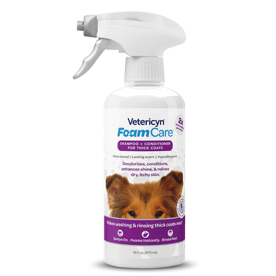 Vetericyn FoamCare Pet Shampoo is a pH balanced, hypoallergenic, spray-on, instant foaming shampoo that's specially formulated for the density of your pet's coat. The easy on, easy off conditioning shampoo saves you time while leaving your animal's skin healthy, conditioned, and nourished and the coat amazingly clean.