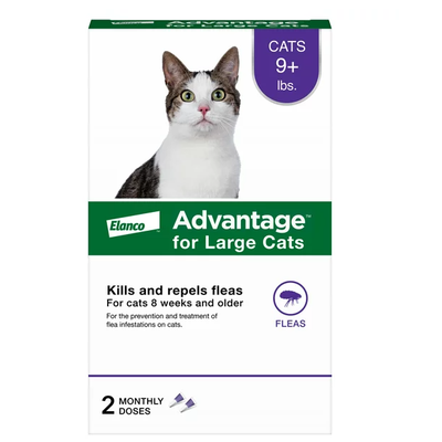 Advantage for Large Cats offers topical flea prevention and treatment to kill fleas fast and prevent new infestations. The convenient, easy-to-apply, fragrance-free solution works on contact within 12 hours of application to kill adult fleas before they bite or lay new eggs. Simply apply to the back of your cat's neck, and the treatment works hard for 30 days, treating existing flea infestations and preventing further infestations on cats for up to four (4) weeks. An excellent value from the Advantage brand, Advantage for Large Cats offers relief for your cat at an affordable price. Your cat should be over 9 lbs and at least 8 weeks of age to use Advantage for Large Cats. No prescription needed. Use as directed by label.