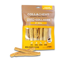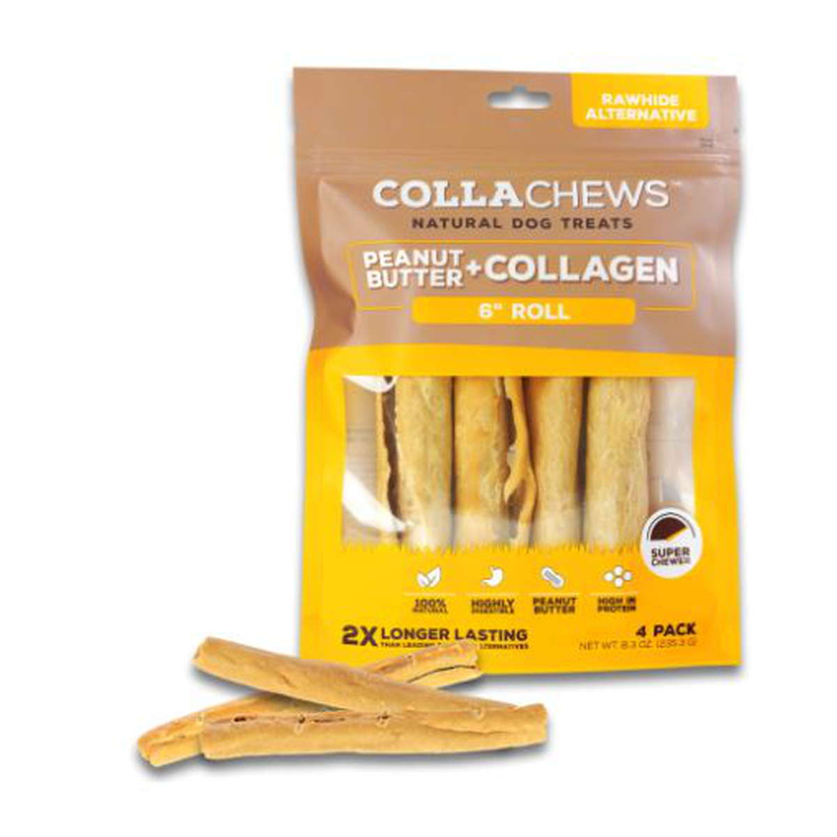 Collachews Peanut Butter Rolls are healthy, all natural, rawhide free alternative dog chews that feature beef + collagen as the #1 ingredient. Made of hydrolyzed collagen peptides, they are an all-natural source of protein, and are highly digestible. They are scientifically-tested to last two times longer than leading rawhide alternatives.