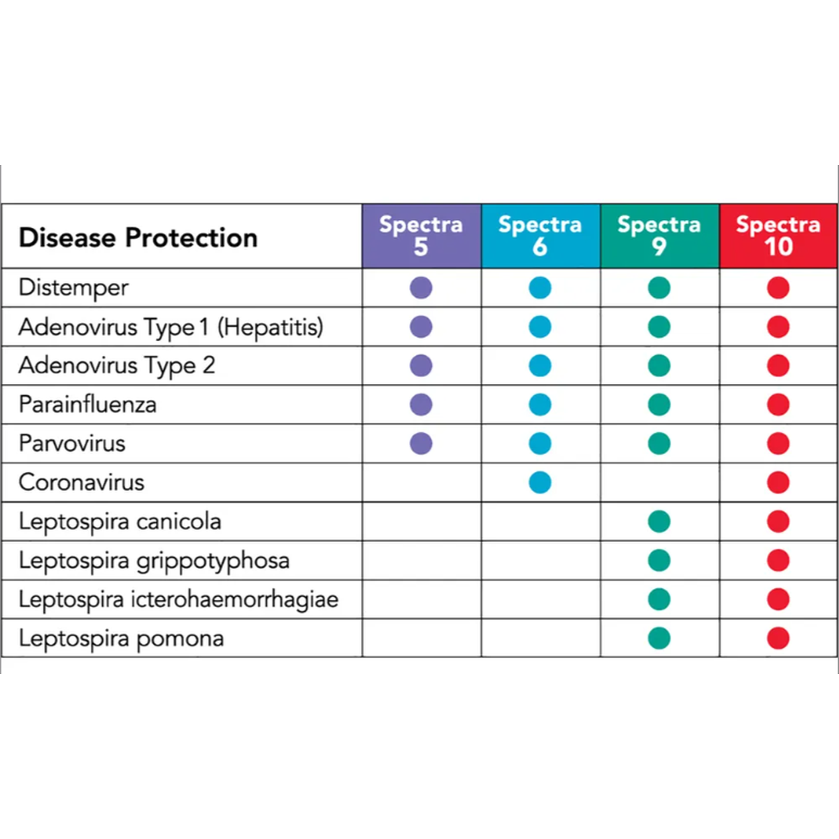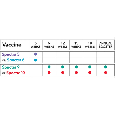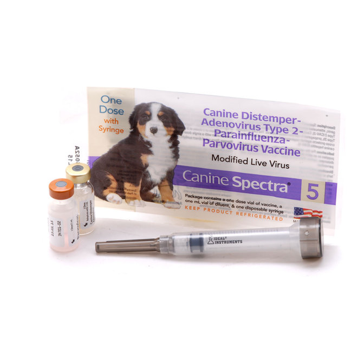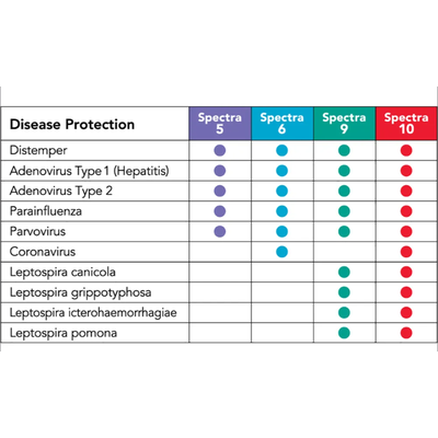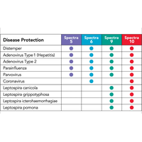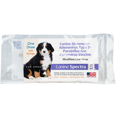 Spectra 5 vaccine is a combination of immunogenic, attenuated strains of Canine Distemper, Canine Adenovirus Type 2 (CAV-2), Canine Parainfluenza, and Canine Parvovirus Type 2b, propagated in cell line tissue cultures.