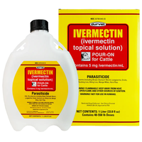 Ivermectin Pour-On for Cattle is a pour-on for treatment and control of parasites in cattle. Ivermectin pour-on is effective against roundworms, lungworms, grubs, horn flies, sucking and biting lice, and sarcoptic mange mites in cattle. Rain-fast after 6 hours. Ivermectin Pour-On contains 5 mg ivermectin per ml. Apply to cattle along the topline in a narrow strip extending from the withers to the tailhead. 1 Liter size includes measuring cup. 2.5L, 4L, and 5L sizes all include a draw-off cap and may be used with Pour-On Gun, sold separately. Safe for pregnant cattle. Use at the rate of 1 ml per 22 lbs. body weight.
