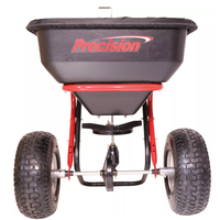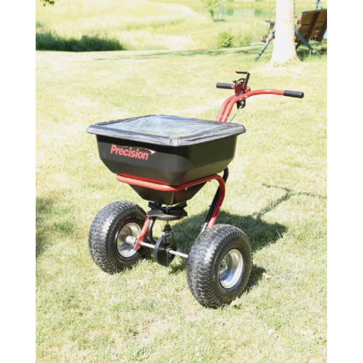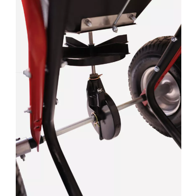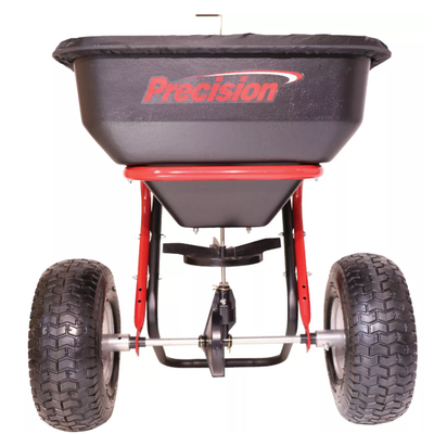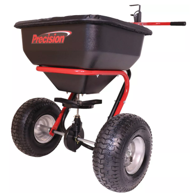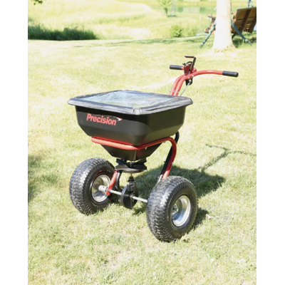 130 lb capacity spreader provides 25,000 sq ft of coverage. Poly hopper and steel spreader plate, direct drive control, powder-coated expanded metal screen, 1" steel tubing, 5/8" solid axle, enclosed metal with grease fitting gears, 10' to 12' spread pattern, direct rod cable control, larger spinner disc, grate, and anti-spill/rain cover. Foam comfort grip T-handles and 15" x 6" pneumatic treaded turf tires. 1 year warranty. Proudly Made in USA.