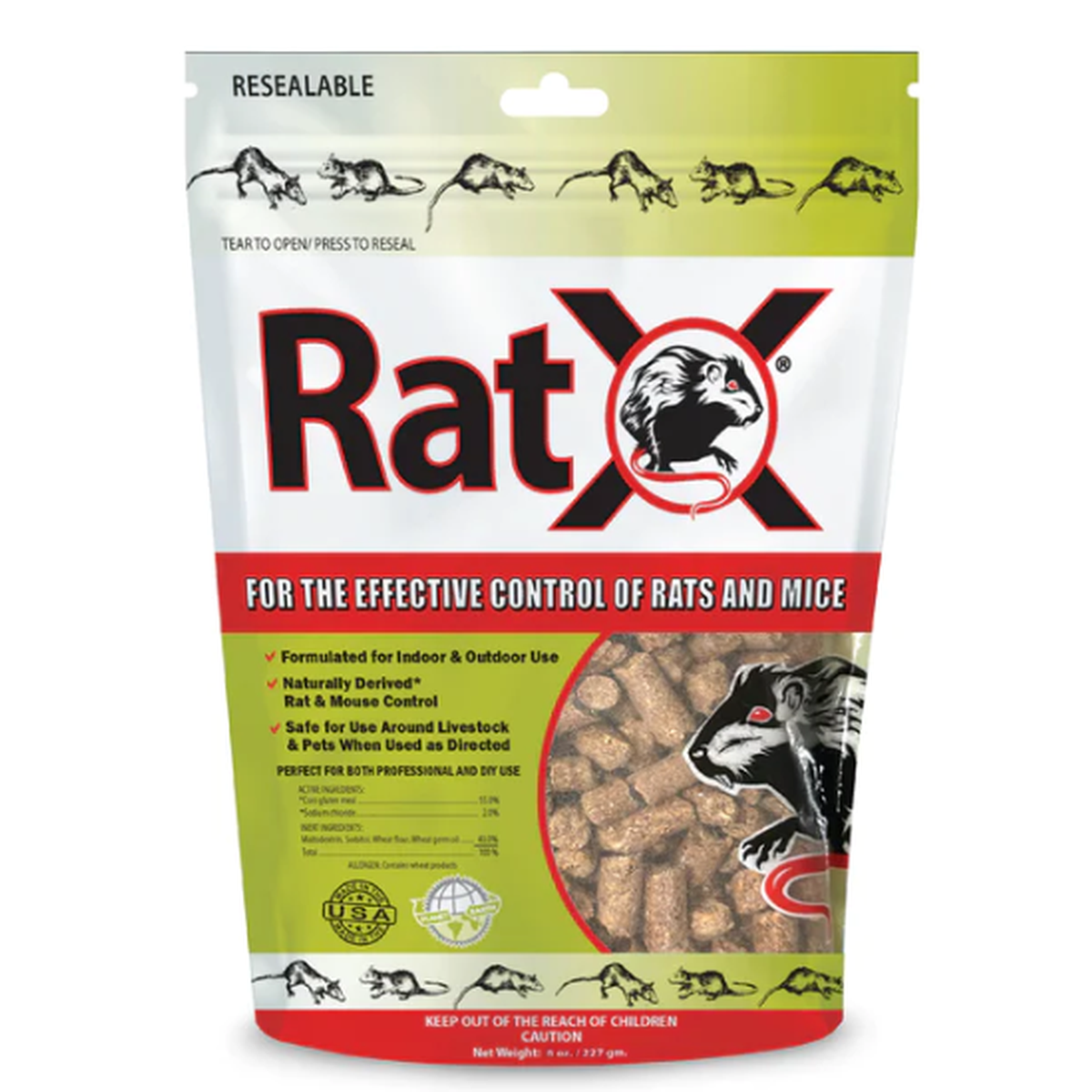 When used as directed, RatX Pellets are effective for indoor and outdoor rat and mouse control. Safe for use around cats, dogs, and children. Place these easy-to-use pellets around landscaping, near livestock or poultry housing, or under buildings or garden structures.