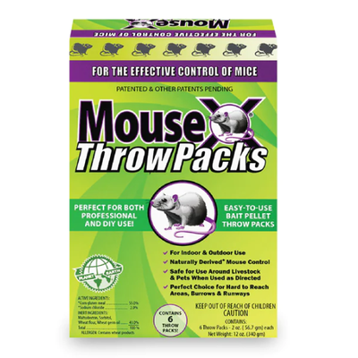 For hard-to-reach areas like mouse and rat burrows, trust easy-to-use MouseX Throw Packs. Formulated using naturally derived ingredients, MouseX Throw Packs contain a measured dose of MouseX pellets, effective for indoor and outdoor mouse and rat control. The bag is made of biodegradable and compostable cellophane, easy for mice and rats to chew through.