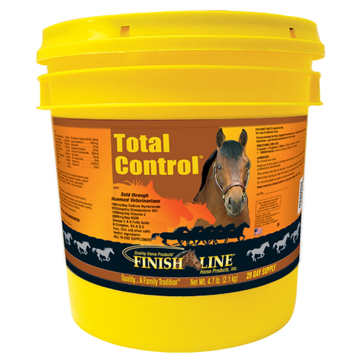 TOTAL CONTROL is a supplement especially for Performance Horses, and is formulated to combine the active ingredients of five Finish Line Horse Products, all into one good-tasting, daily supplement.