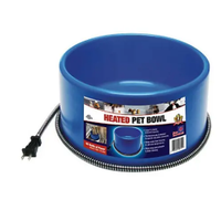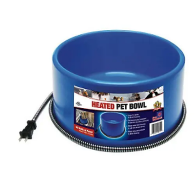 Heated plastic pet bowl features heavy duty anti-chew cord protector, with 60W of power and thermostatically controlled. Great for large dogs. 1.5 Gallon/ 6 Quarts capacity