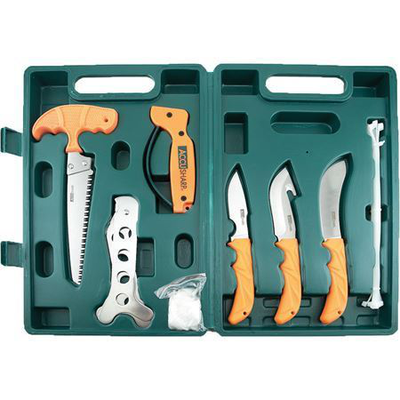 Includes: 4 inch butcher knife; 3 inch caping knife; 3.5 inch guthook knife; 6 inch bone saw; ribcage spreader; zip ties; game cleaning gloves; pull-through knife sharpener
