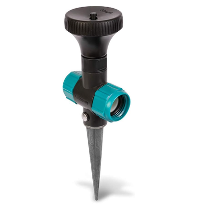 Base has outlet valve for connecting multiple sprinklers and a durable metal spike for stability