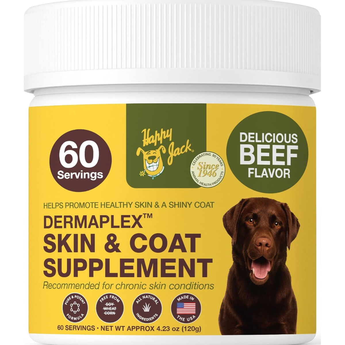 Newly-reformulated Dermaplex promotes glossy coats and aids in the growth of hair after loss due to eczema, mange, fungus infections, hot spots (moist dermatitis) & superficial wounds. Also recommended for chronic skin conditions such as flea allergies (flea bite dermatitis), allergies to grass, dry skin and dull coat. Simply mix specified amount in food daily.