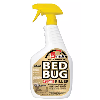 Harris 5-Minute Egg and Resistant Bed Bug Killer, 32 oz. ready to use, kills all bed bug life stages: adults, nymphs and eggs. This new generation insecticide is used by Professional Exterminators. It is effective for residential and commercial use and it kills bed bugs in 5-minutes. Treat directly on mattresses, seams, folds, box springs, furniture, carpet edges, closets, baseboards, pet areas, luggage, backpacks and shoes. Residual spray is long-lasting, odorless and non-staining.
