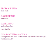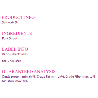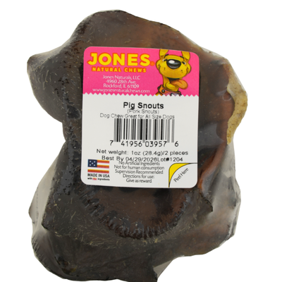 Jones Natural Chews Pig snouts are tasty, single-ingredient chew that are completely digestible. These are sourced from swine raised on USA farms and ranches and slow-roasted for a tasty flavor that dogs love. Snouts are more dense than a pig ear or skin, giving a more crunchy and chewy texture. It is an appropriate chew for any size dog, and will keep them busy gnawing, which helps their dental health. All Jones Natural Chews products are raised and handcrafted in the USA and responsibly sourced.