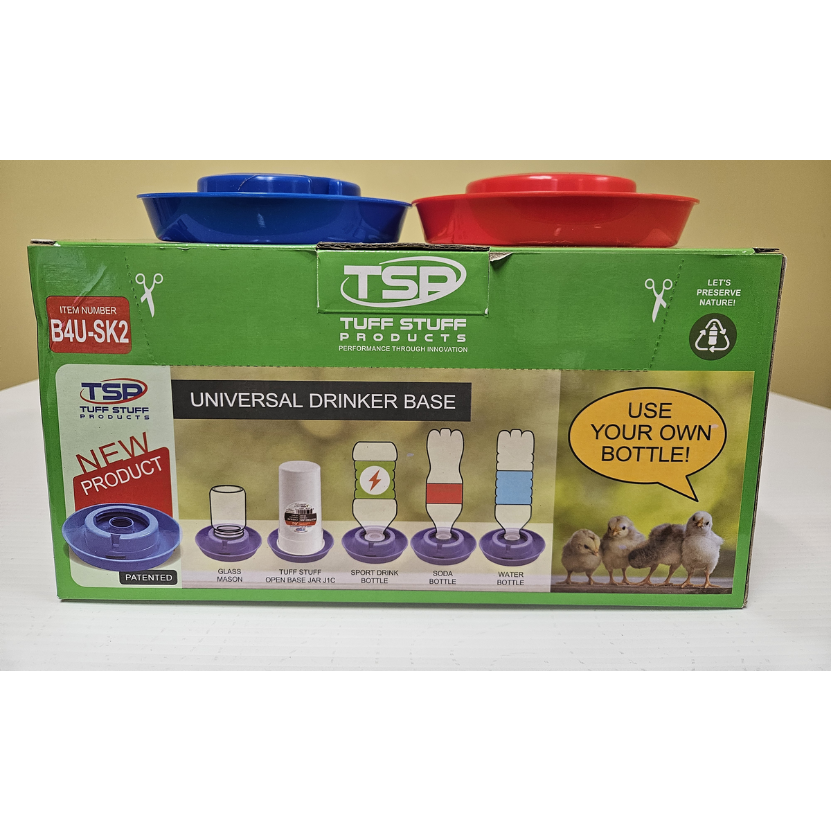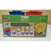 The Tuff Stuff Universal Drinker Base is the unique poultry drinker solution you have been searching for! The patented design ensures that most of your favorite drink bottles, including sports drink bottles, water bottles, and soda bottles can be used to create your own poultry waterer. Tuff Stuff Universal Drinker Base can also be used with Tuff Stuff Open Base Jug (J1C)) or a glass mason jar. Simply fill with water and screw your chosen bottle into the base.