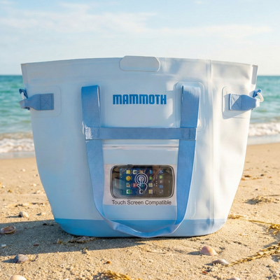 Never worry about water ruining your day. The Mammoth Waterproof Bag features heavy-duty, puncture-resistant material, a magnetic closure, and reinforced seams to keep your essentials completely dry. Designed for ultimate portability and durability, this bag is perfect for the beach, boat, or the ball field. Waterproof transparent electronic compartment on the back to ensure the safety of phones and other electronic devices during camping.