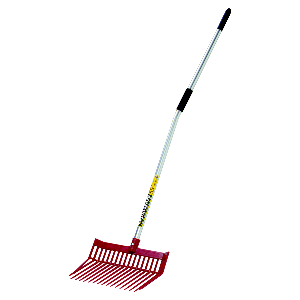Bedding fork with 52 inch anodized aluminum handle, pre-bent at an ergonomic handle to help reduce back strain.