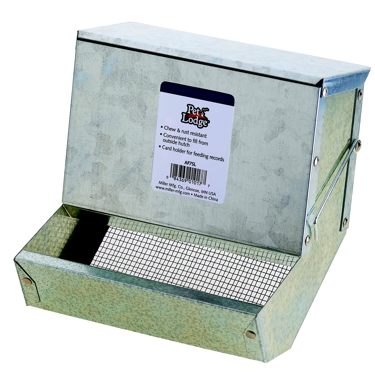 Independent wire hooks allow feeder to be attached to the inside of the hutch, or for more convenient filling to the outside with some wire cutting.