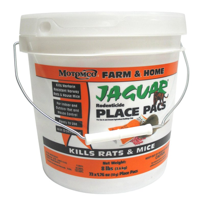 Jaguar Rodenticide Place Pacs contain 50gm of pelleted bait in pre-measured, ready-to-use Pacs. Jaguar Rodenticide Place Pacs contain the active ingredient Brodifacoum, Motomco's most powerful anticoagulant. Jaguar is our best-selling brand with poultry and swine producers and is especially successful at cleaning out tough infestations. For baiting around agricultural buildings and areas with a lot of rodent pressure, Jaguar is the choice that works. Place Pacs keep bait fresh by protecting the pellets from contamination by odors, dirt, and moisture. Great for putting bait in tight spaces and hard to reach areas.