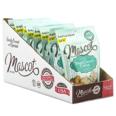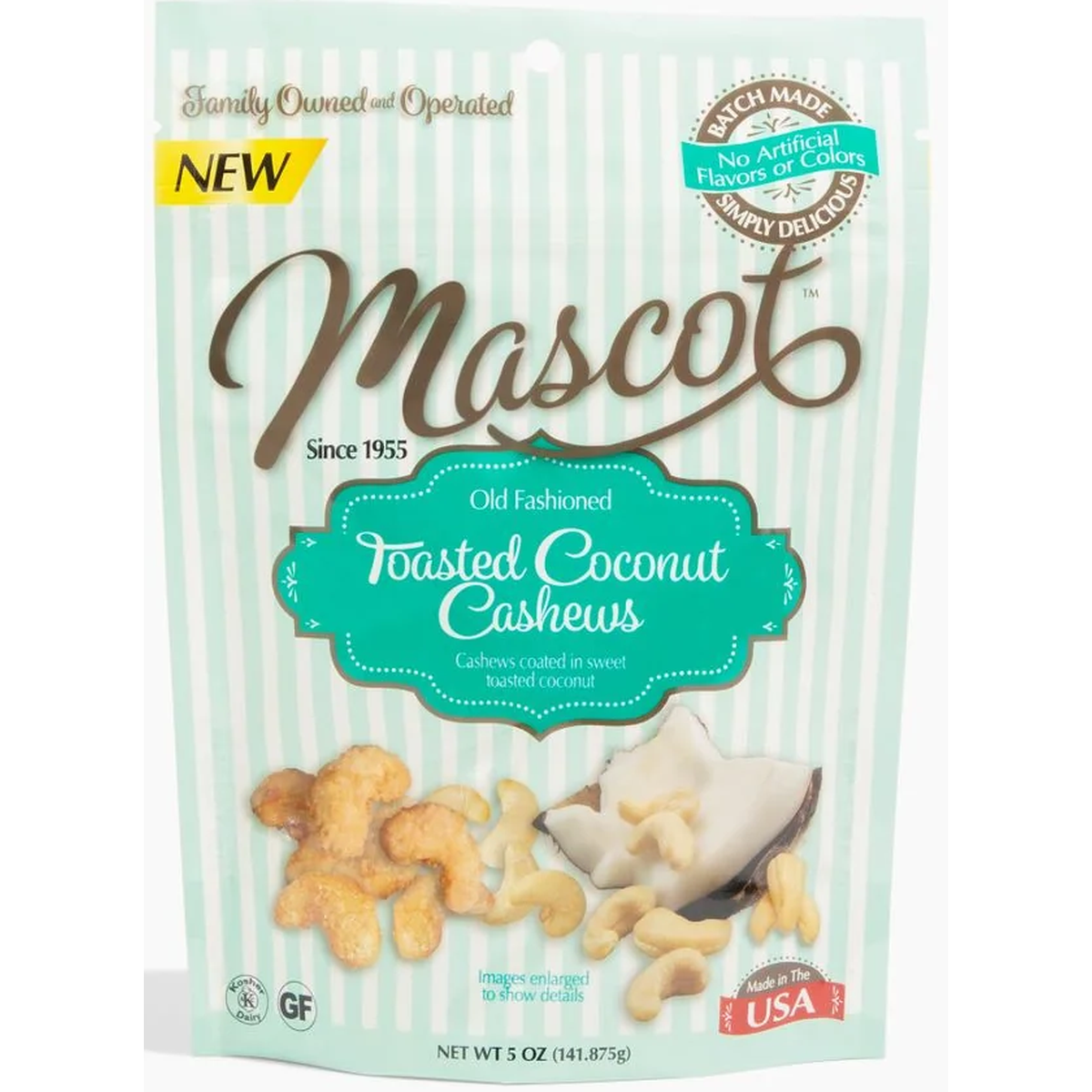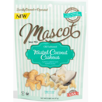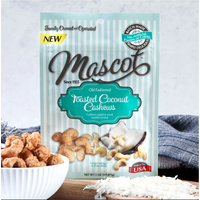 Mascot's roasted cashews are coated with a sweet toasted coconut crunch for an unexpected flavor combination. You won't be able to put this bag down!
