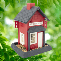 The General Store birdfeeder is "OPEN" for business! As part of our Village Collection of feeders, the General Store brings Main Street USA to your backyard. Included are fun details like the "OPEN" sign on the corner of the building as well as a bright red door and "GENERAL STORE" sign. There's also a mailbox and flowerpot molded into the design. This large capacity feeder holds an extra-large 6.5 lbs. of your favorite wild bird or sunflower seed and can be easily monitored through the clear windows. Refill by simply removing the chimney and pouring in your favorite birdseed. All of the Village Collection birdfeeders are easy to clean by removing the large tray/perch. This versatile feeder can either be used as a hanging birdfeeder or pole mounted and offers a three year warranty. Made from durable molded plastic, this feeder measures 9.5 x 10.25 x 14.5 inches high, it's the perfect size for your feathered friends to gather
