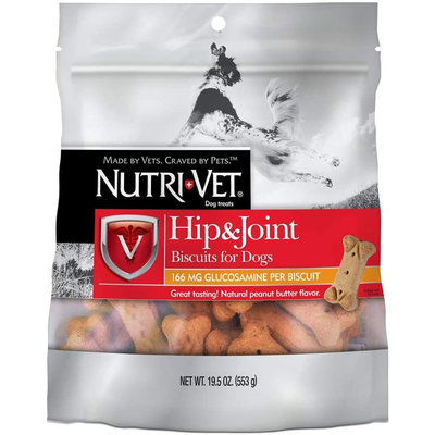 Nutri-Vet Hip & Joint Biscuits provide standardized levels of glucosamine for dogs in a crunchy wafer to help maintain healthy canine joint function and connective tissue. This peanut-butter flavored treat is veterinarian formulated to provide the best joint supplement for dogs.