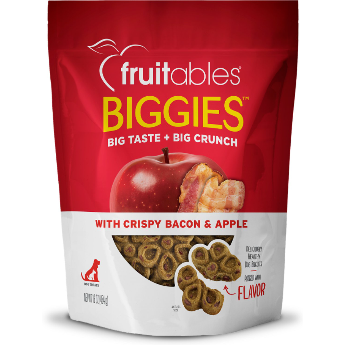 Go big or go home - Fruitables is certainly not going home with these Biggies Crispy Bacon & Apple Dog Treats! These extra crispy treats pack big, bold taste with healthy ingredients, including real fruits and veggies to really get your canine companion's tail wagging. This paw-ticular flavor features real bacon and apple, a flavor combination that's hard for any hound to resist