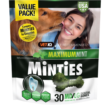 Give your precious pup kissably fresh breath with VetIQ Minties Dental Medium/Large Dog Treats. These vet recommended chews feature a triple action formula that helps clean your dog's teeth, promote fresh breath, and control plaque and tartar. Each treat contains five natural breath fresheners to promote minty fresh breath and help break down odor causing particles in his tummy. They're also free from wheat, gluten, soy, corn, artificial flavors and animal by-products so they're easy to digest and ideal for pups with sensitivities to certain ingredients