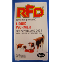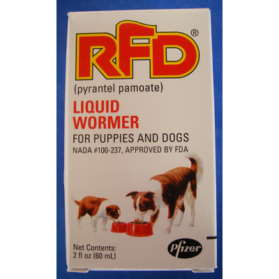 The Zoetis RFD Dewormer Liquid for Puppies and Dogs is a single-dose treatment for removal of large roundworms and hookworms in adult dogs and puppies. This pet dewormer helps prevent the re-infestation of T. canis in adult dogs, puppies and lactating dogs after whelping. The work treatment for dogs comes in a 60 ml liquid bottle. The dog wormer is also formulated with pyrantel pamoate.