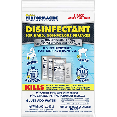 PERFORMACIDE is registered for use in hospitals, medical laboratories, rehabilitation facilities, diagnostic centers, clinics, first responder facilities, and equipment, veterinary hospitals, medical equipment, pharmaceutical facilities, and laboratories. Performacide uses a pre-measured pouch that when immersed in the corresponding amount of water creates a 100 ppm chlorine dioxide solution. Allow the pouch 60 minutes to reach full activation, and the 100 ppm ClO2 solution lasts 15 days when stored in an oxidation-proof, dark closed or sealed container in a cool dark location. Using EPA label directions, PERFORMACIDE can be diluted to 20 ppm for use as a sanitizer on non-food contact surfaces, and 5 ppm for use as a sanitizer on food contact surfaces