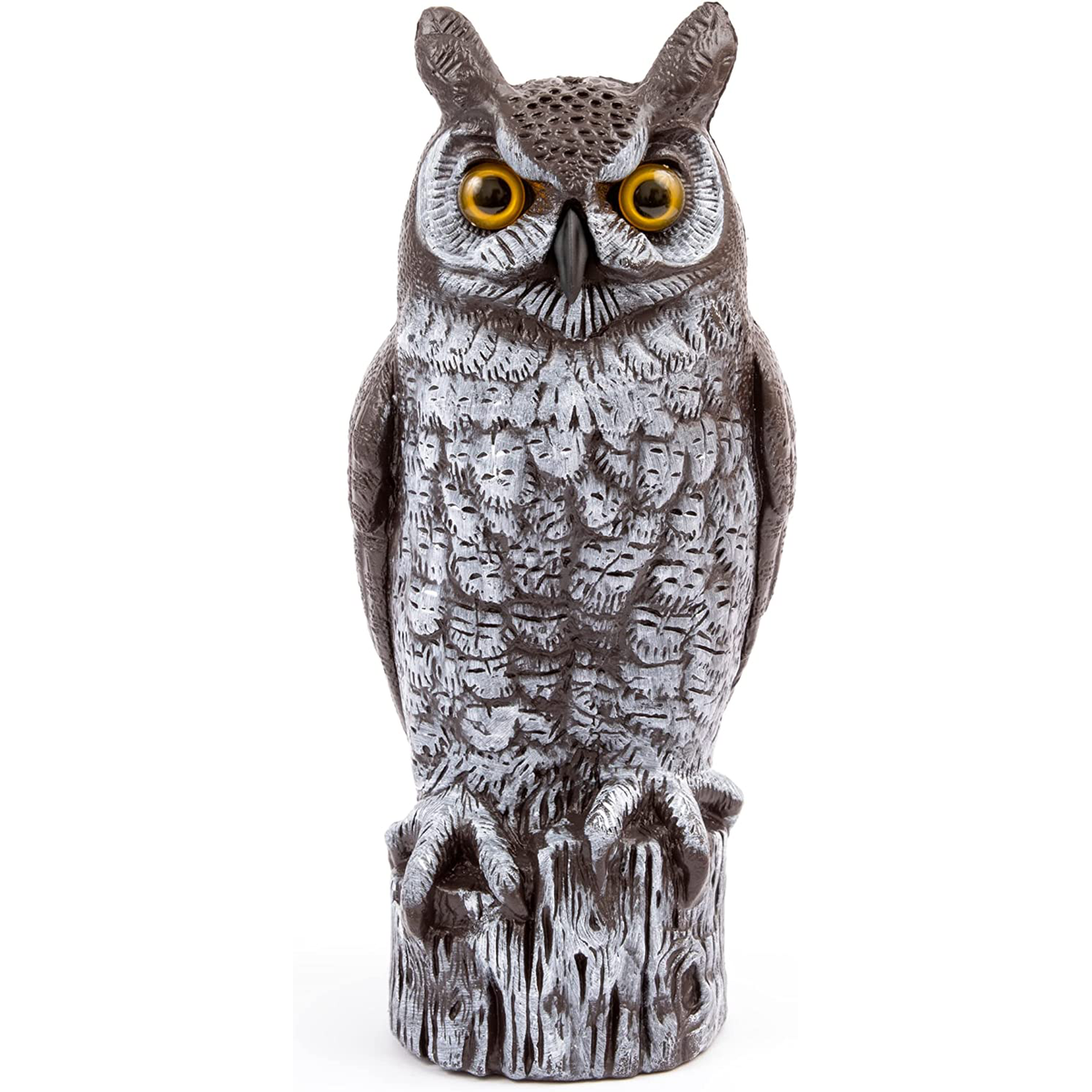 This Natural Enemy Scarecrow deters pests from your yard and gardens. With its realistic design, Gardener's Great Horned Owl is the perfect deterrent device. This chemical-free device safely deters birds and unwanted pests and protects your dock, deck or boat. The hand-painted life-like design makes it look realistic and attractive to use in any place that needs some pest control.