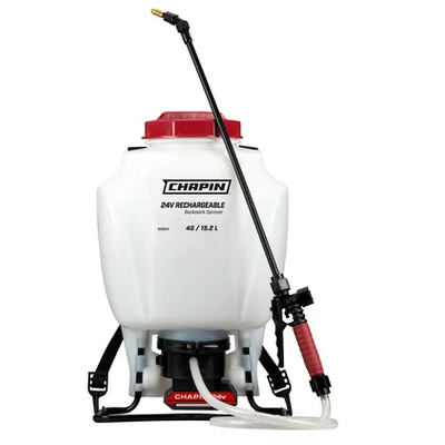 This lightweight Chapin 4 Gallon Backpack Sprayer is powered by a rechargeable 24V Lithium ion battery, giving you up to 2 hours of continuous spraying per charge. Great for general purpose cleaning, and fertilizer, weed & feed, fungicide, herbicide and pesticide application. Sprays up to 58 gallons on a single charge. Includes 48in. hose, 20in. spray wand and battery charger.