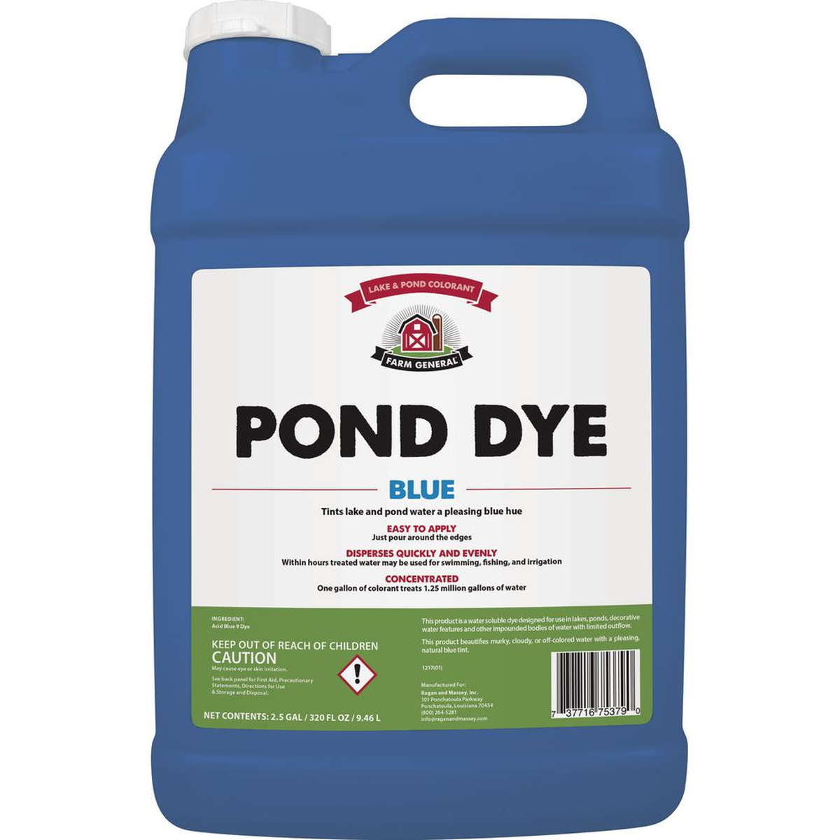 Transform murky, cloudy, and off-color water with Farm General Pond Dye. Our water-soluble pond colorant beautifies lakes, ponds, and decorative water features within hours by simply pouring the product at the edge and watching disperse evenly and quickly throughout the water. Treated water may be used for swimming, fishing, and irrigation within hours and will not stain or affect fish, waterfowl, pets, or wildlife when used at the recommended dosage