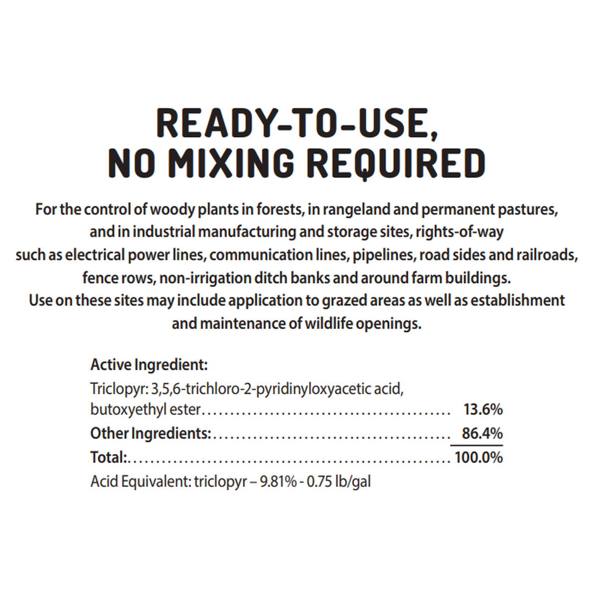 A powerful solution to control woody plants in your pastures and around your property. This ready-to-use herbicide requires no mixing. It can be applied nearly anywhere woody plant species are growing including: forests, in rangeland and permanent pastures, and in industrial manufacturing and storage sites, rights-of-way such as electrical power lines, communication lines, pipelines, road sides and railroads, fence rows, non-irrigation ditch banks and around farm buildings