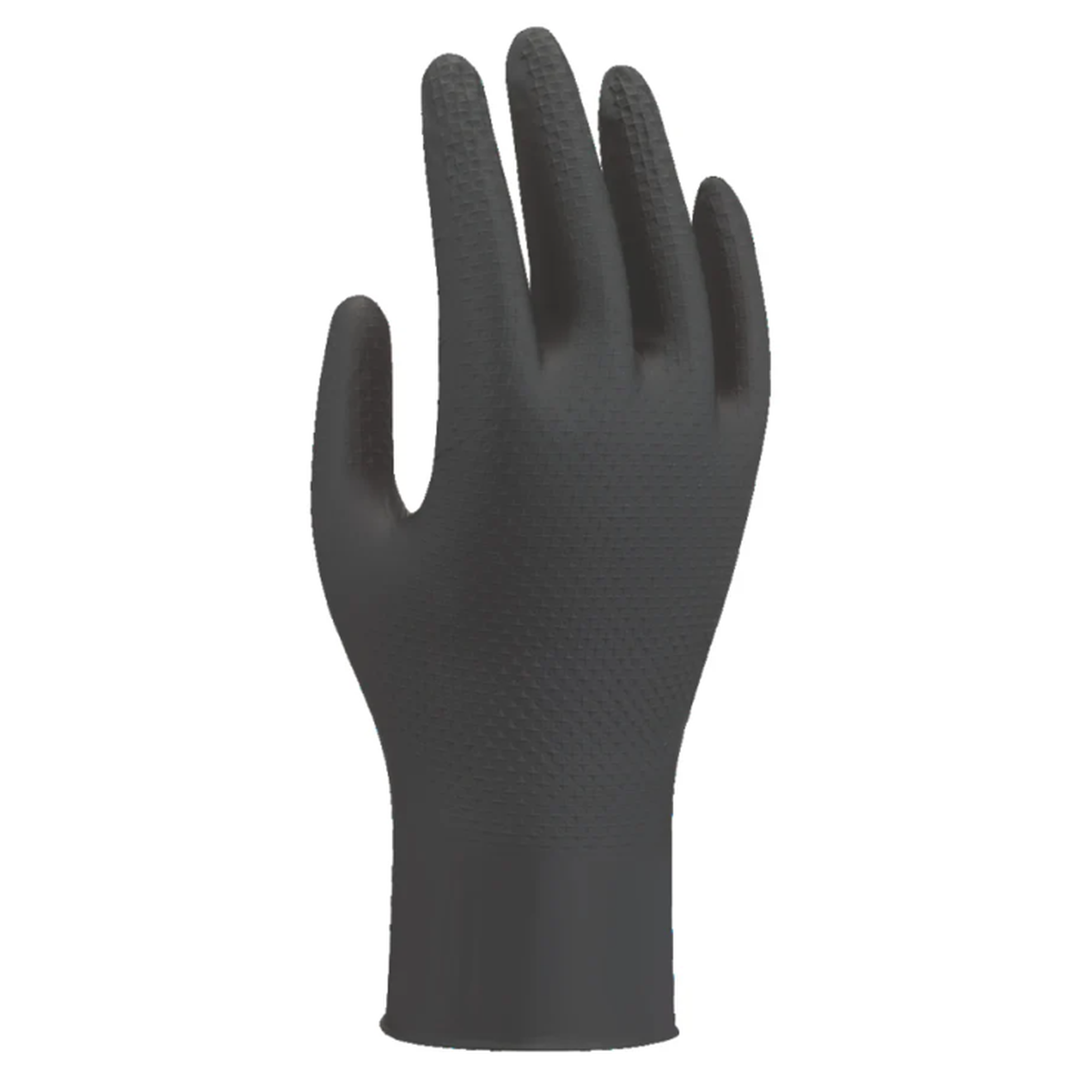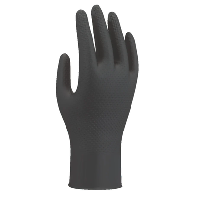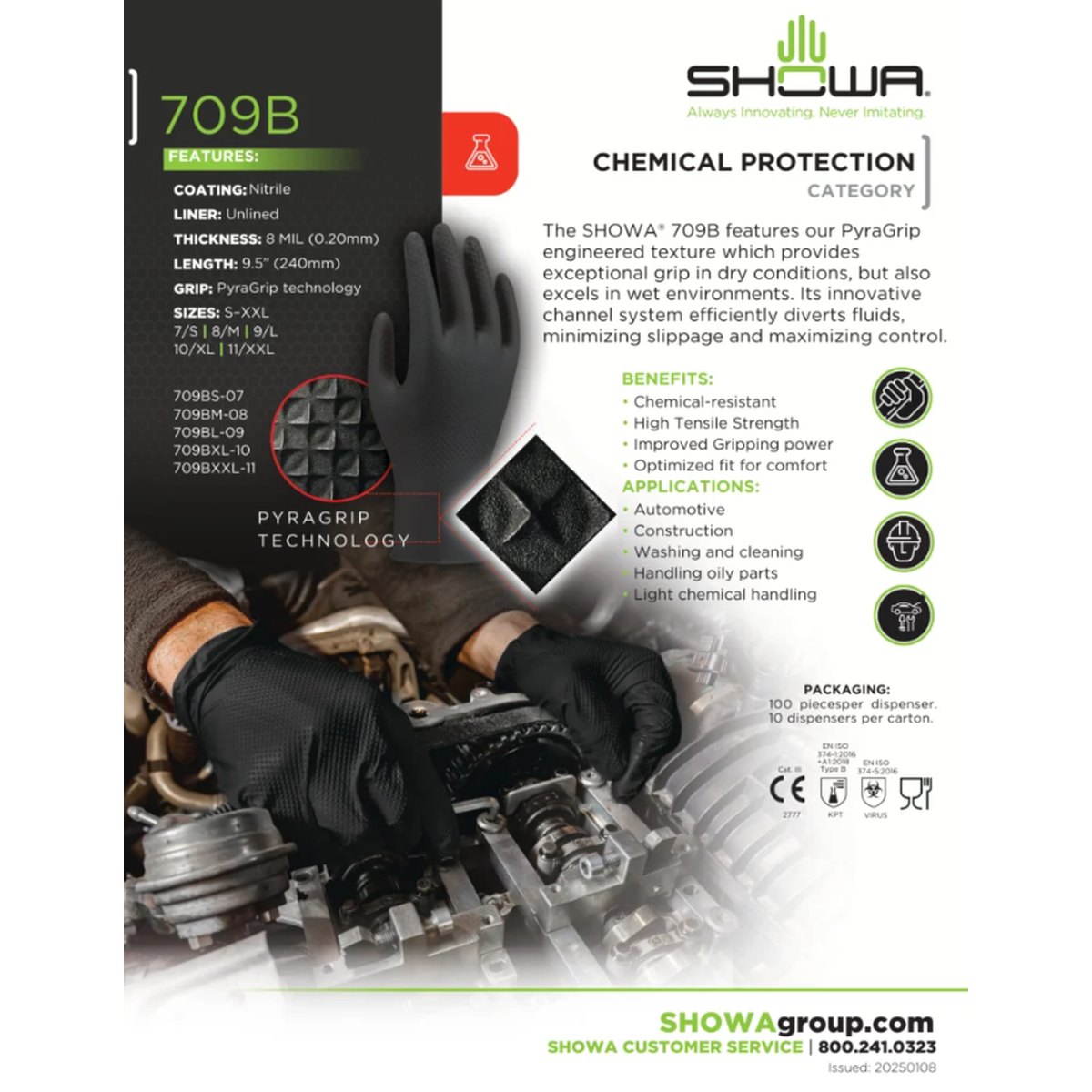 The SHOWA 709B glove, 8-mil thick nitrile, features our PyraGrip engineered texture. This unique texture provides exceptional grip in both dry and wet conditions. An innovative channel system efficiently diverts fluids, minimizing slippage and maximizing control.