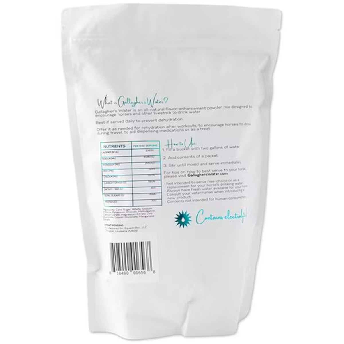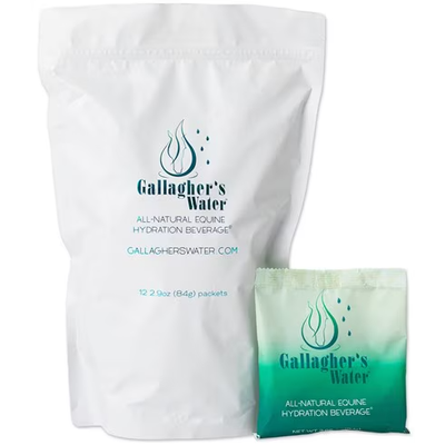 Gallagher's Water is a formulated alfalfa-flavored electrolyte powder mix that transforms your horse's water into an irresistible treat with benefits. Served daily or during those times your horse needs it the most, Gallagher's Water helps to ensure your horse is properly hydrated. It can be served warm when the temperature drops and is ideal when hauling and traveling or as a workout recovery. Includes electrolytes but also flavors to really help horses drink the water they need. Sugar found in this product is minimal and makes up only 2% of your horse's daily sugar intake. This all-natural equine hydration enhancement powder is designed to encourage drinking for a healthier happier horse.