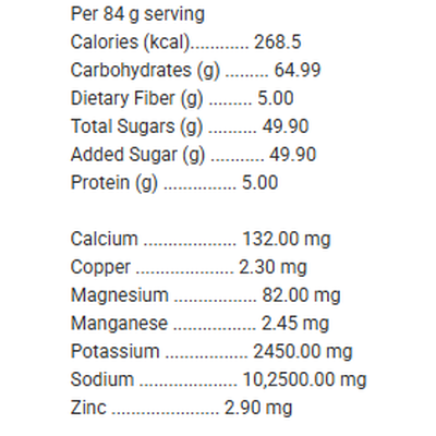 - Ingredients: Cane Sugar, Alfalfa, Sodium Chloride, Potassium Chloride, Maltodextrin, Calcium Citrate, Magnesium Citrate, Zinc Gluconate, Copper Gluconate, Manganese Citrate